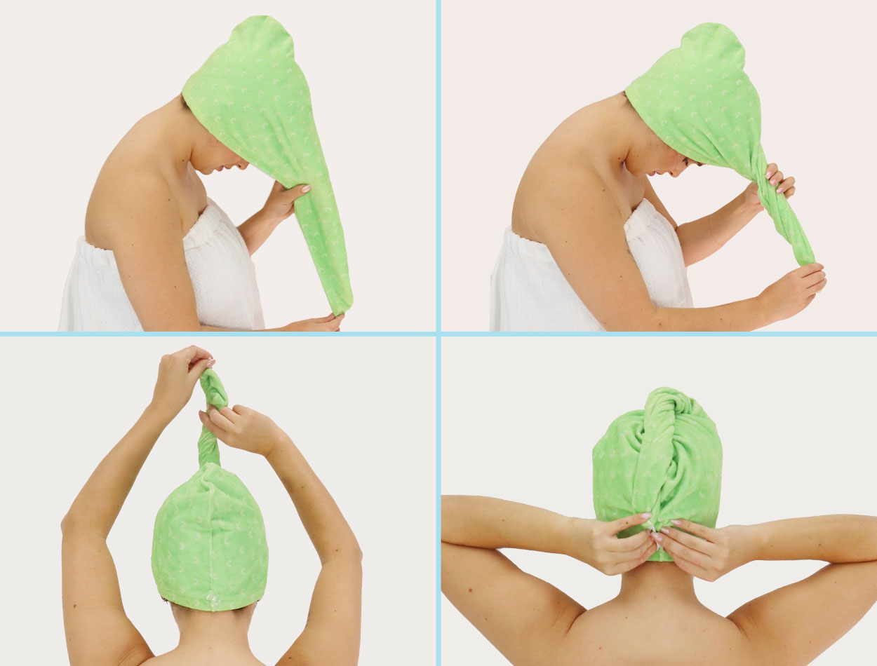After washing hair and squeezing out any excess water, flip head forward and place the larger end with the button over the back of your head. Gather hair inside the towel and twist until feeling secure. Fasten with the elastic loop, to the button at the nape of neck.